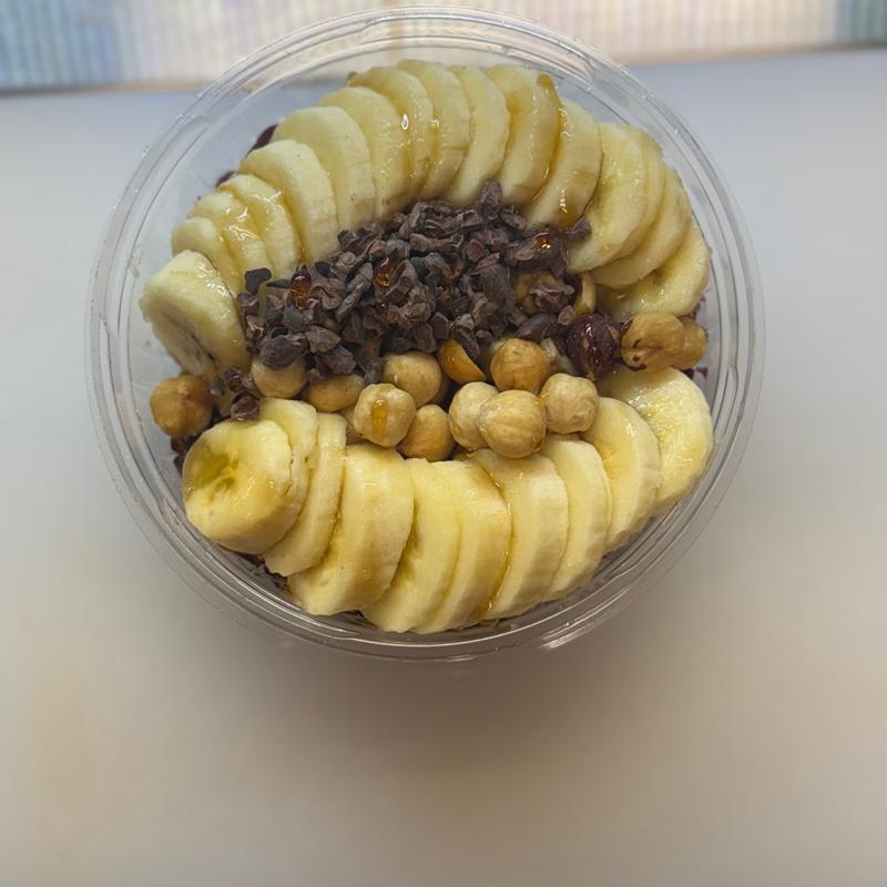 Organic acai base topped with granola, banana, cacao nibs, hazelnuts, shredded coconut, maple syrup drizzle